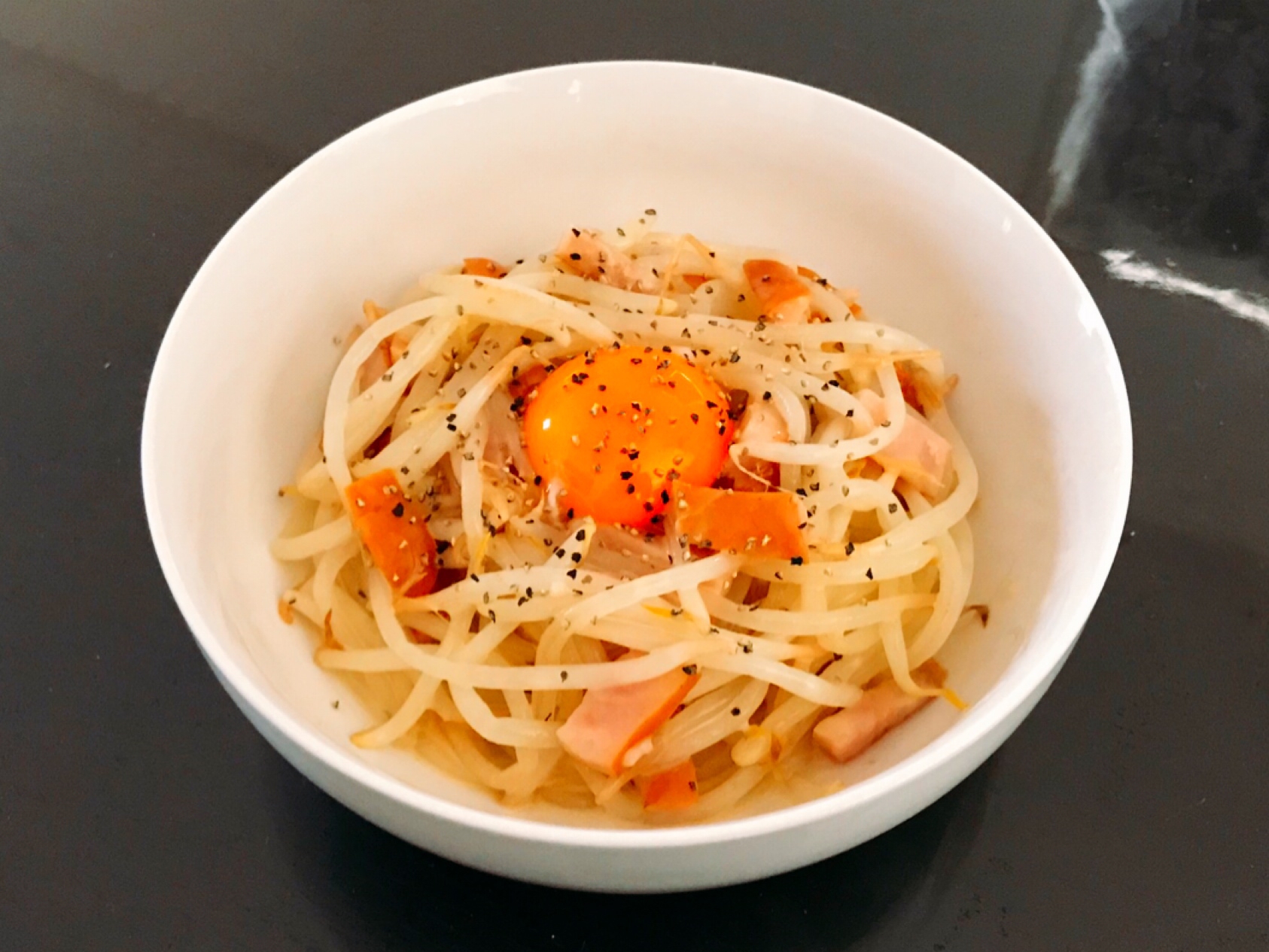 リュウジ 料理のおにいさんバズレシピ 麺の代わりにもやしでカルボナーラを作ったら 早い 旨い 安い 低糖質 火不使用 の五拍子揃ったパーフェクトフードになりました もやしカルボナーラ もやし0g ベーコン50g にんにく1片 コンソメ小1 塩少々入れ
